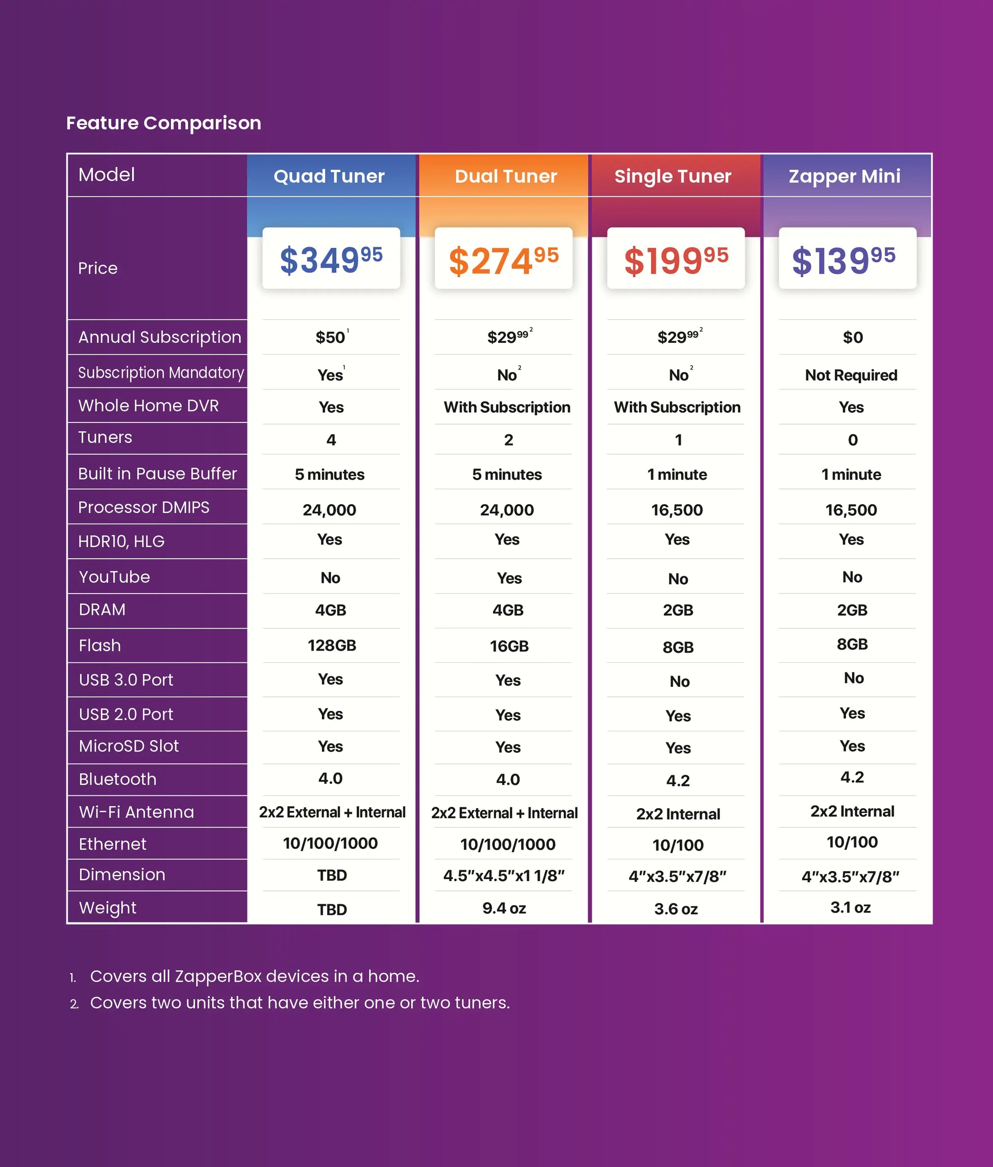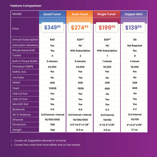 ZapperBox dual tuner 4K over-the-air, whole-home DVR that allows you to get high-resolution local TV programming without a monthly subscription. Most of the programs you watch are local broadcast channels like ABC, CBS, FOX, NBC, PBS, and The CW. You don’t need to pay hundreds of dollars a month to watch and record the shows you love.